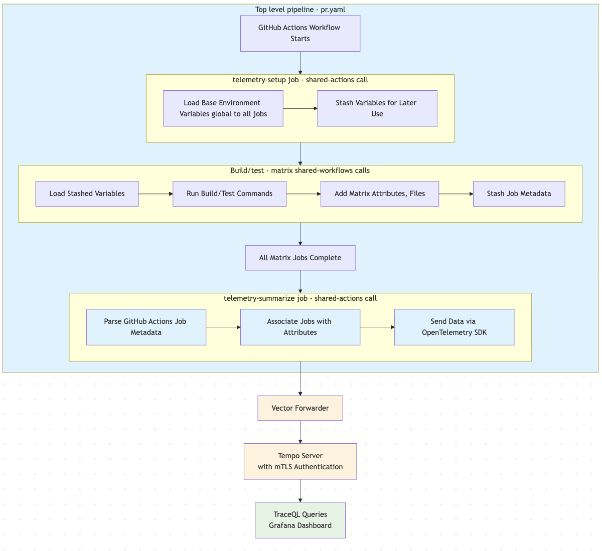 telemetry-summarizejob parses GitHub Actions metadata and associates it with workflow attributes - Transmission Phase: Data sent via OpenTelemetry SDK through Vector to Tempo. Also happens in telemetry-summarize job in pipeline.